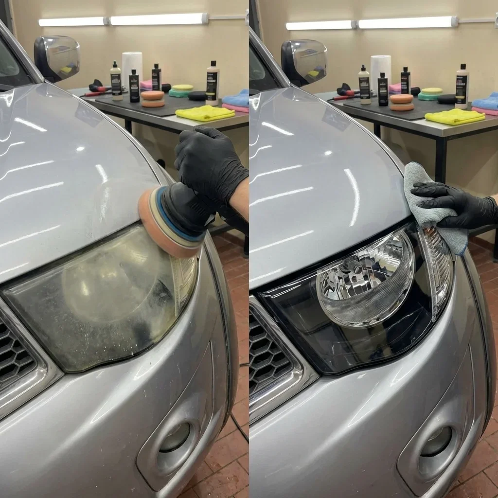 Помутневшие фары снижают яркость на 40-60% — это опасно. Полировка возвращает заводскую прозрачность за 30 минут, а защитное покрытие сохраняет результат на годы.